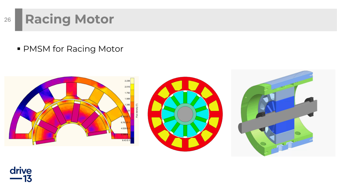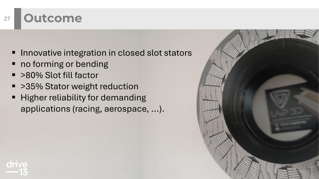 赛车领域对电机的要求极为严苛,需要电机具备高功率密度、轻量化、高可靠性的特点,Drive13 为赛车打造了永磁同步电机(PMSM),核心技术是将 3D 打印铝基绕组集成到闭口槽定子中,全程无需对绕组进行成型、折弯等二次加工。