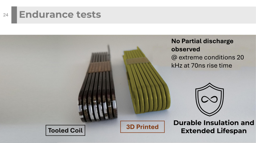 在耐久性测试中,Drive13 的 3D 打印铝线圈在20kHz 高频、70ns 上升时间的极端条件下,仍未观察到局部放电现象,证明其绝缘层的耐久性与稳定性远超传统工装线圈,大幅延长了电机的使用寿命。