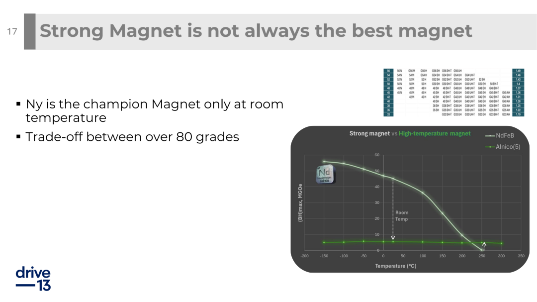 磁体的性能直接影响电机的动力输出,但 Drive13 的研发团队提出了全新的理念:强磁体并非在所有场景下都是最好的。比如传统的钕铁硼磁体,仅在室温下能保持优异的性能,一旦处于高温环境,其性能会急剧衰减;而铝镍钴磁体虽在室温下的性能不如钕铁硼,但在高温场景下能保持稳定的性能输出。