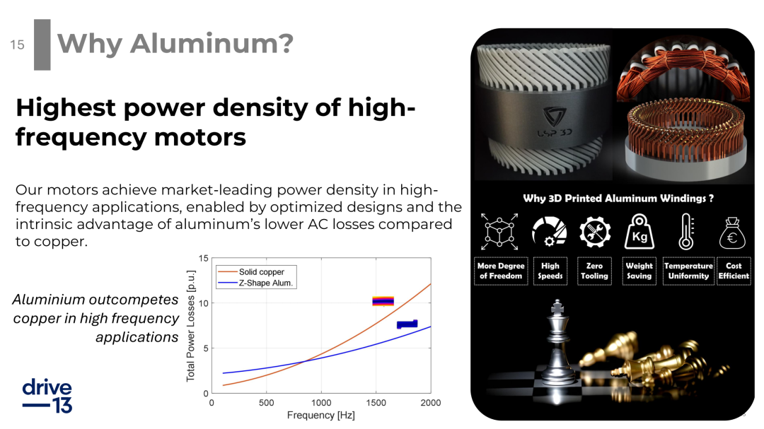 除此之外,3D 打印铝基绕组还拥有六大核心优势:更高的设计自由度、零工装成本、温度分布更均匀、制造成本更低、电机重量更轻、运行效率更高。这些优势叠加,让 Drive13 的铝基 3D 打印电机在高频应用场景下,实现了市场领先的功率密度,成为高频高功率密度电机的最优解。