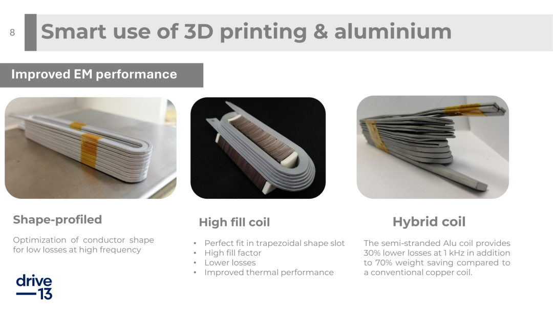 针对传统铜绕组的痛点,Drive13 通过 3D 打印技术打造了三款创新铝基绕组,从结构设计上实现了损耗降低、重量减轻、性能提升: