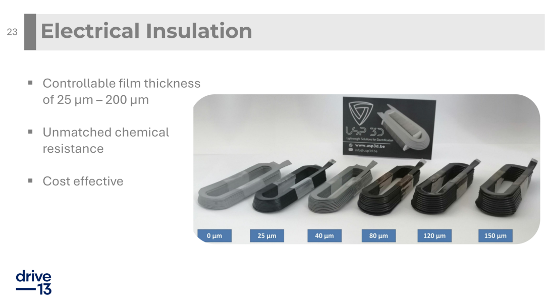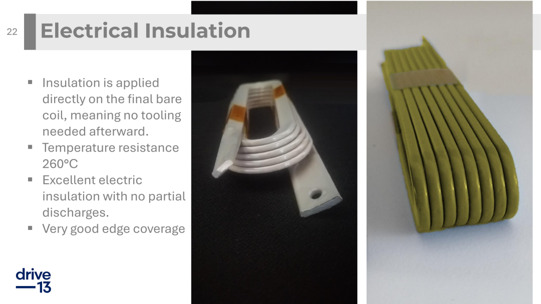 针对这些痛点,Drive13 延续了 “先成型、后涂层” 的工艺逻辑,打造了全新的绝缘解决方案:在 3D 打印完成的最终裸线圈上直接施加绝缘涂层,全程无需对线圈进行折弯、工装等二次加工,从根源上避免了绝缘层的损伤。这一绝缘方案拥有诸多优势: