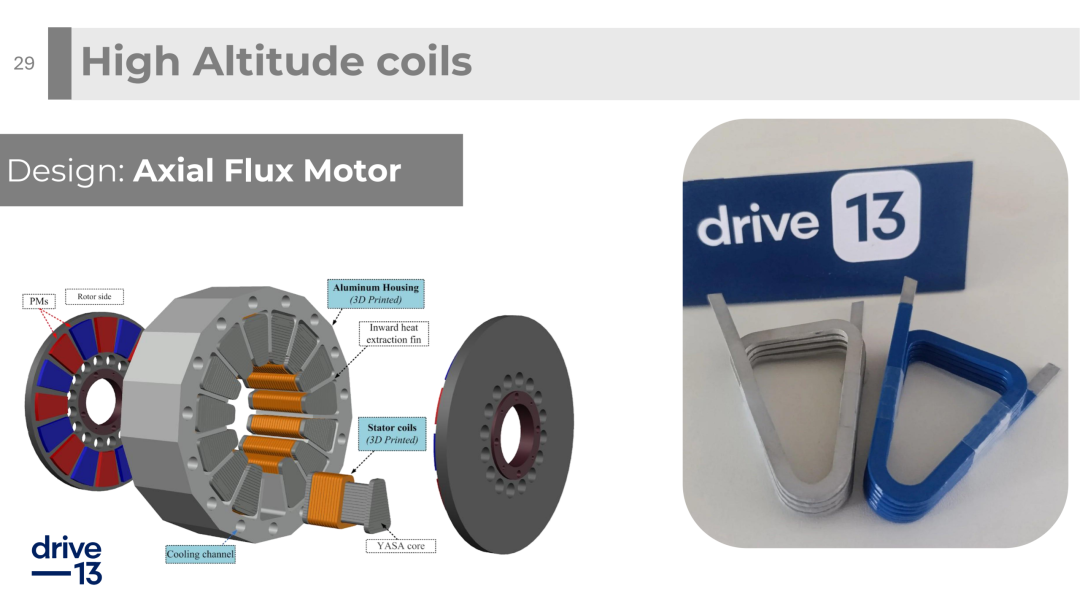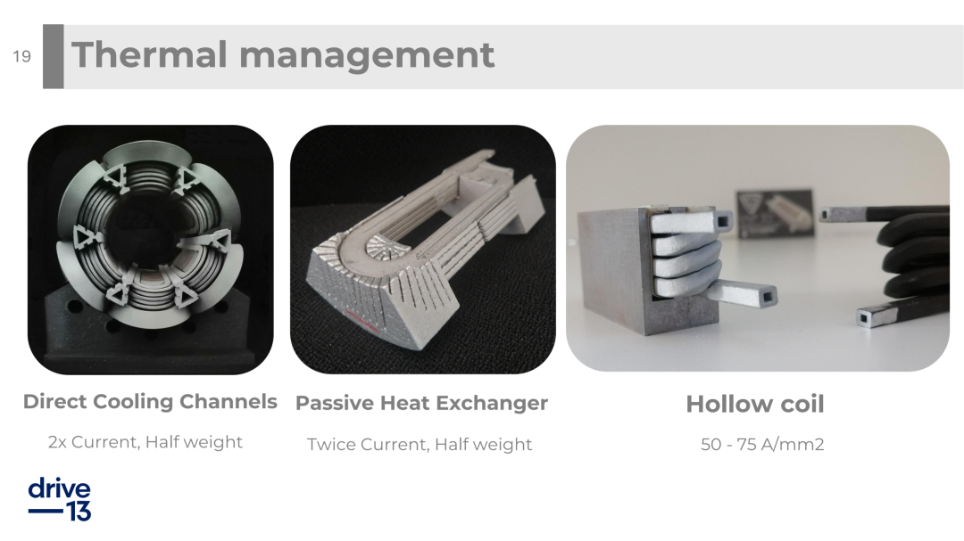 热管理是提升电机功率密度的关键,电机的散热效率越高,能承载的电流密度就越大,功率密度也随之提升。Drive13 通过 3D 打印技术,打造了被动换热器 + 直接冷却通道的一体化热管理方案,冷却通道与电机绕组、定子等核心部件通过 3D 打印实现一体化成型,让散热更直接、更高效。