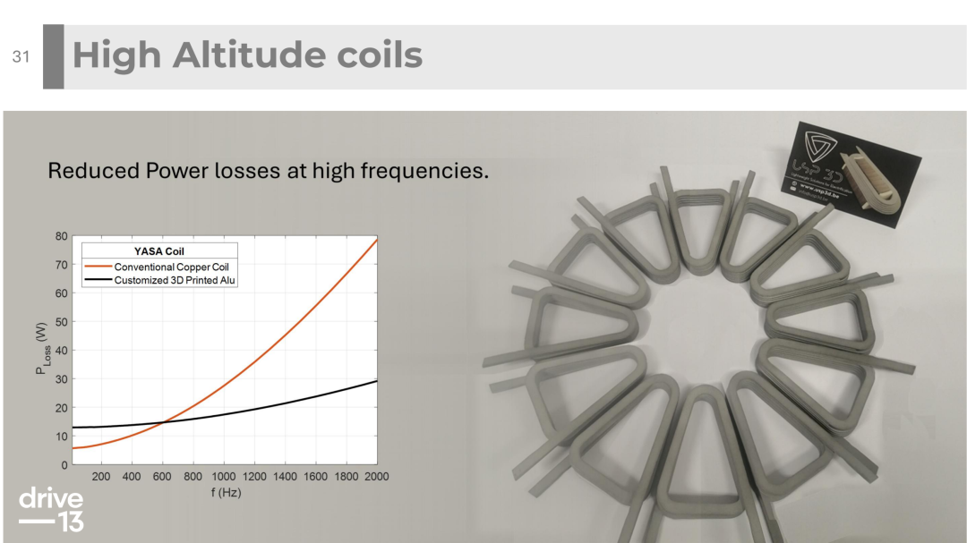 Drive13 为高空场景设计了轴向磁通电机,采用铝外壳、3D 打印永磁体和 3D 打印定子线圈的一体化设计,冷却通道内置实现向内散热,从结构上提升电机的散热与绝缘性能。针对高空的绝缘难题,Drive13 优化了绝缘材料,让线圈的局部放电活动大幅减少、起始电压显著提升,打造了无空隙的绕组结构,实现了高抗局部放电能力,彻底解决了高空空气击穿电压低的问题;同时,3D 打印铝基线圈在高频场景下的功率损耗大幅降低,对比 YASA 线圈、传统铜线圈,Drive13 的定制化 3D 打印铝线圈在 0-2000Hz 的全频率段,功率损耗均处于最低水平,完美适配高空设备的高频运行需求。