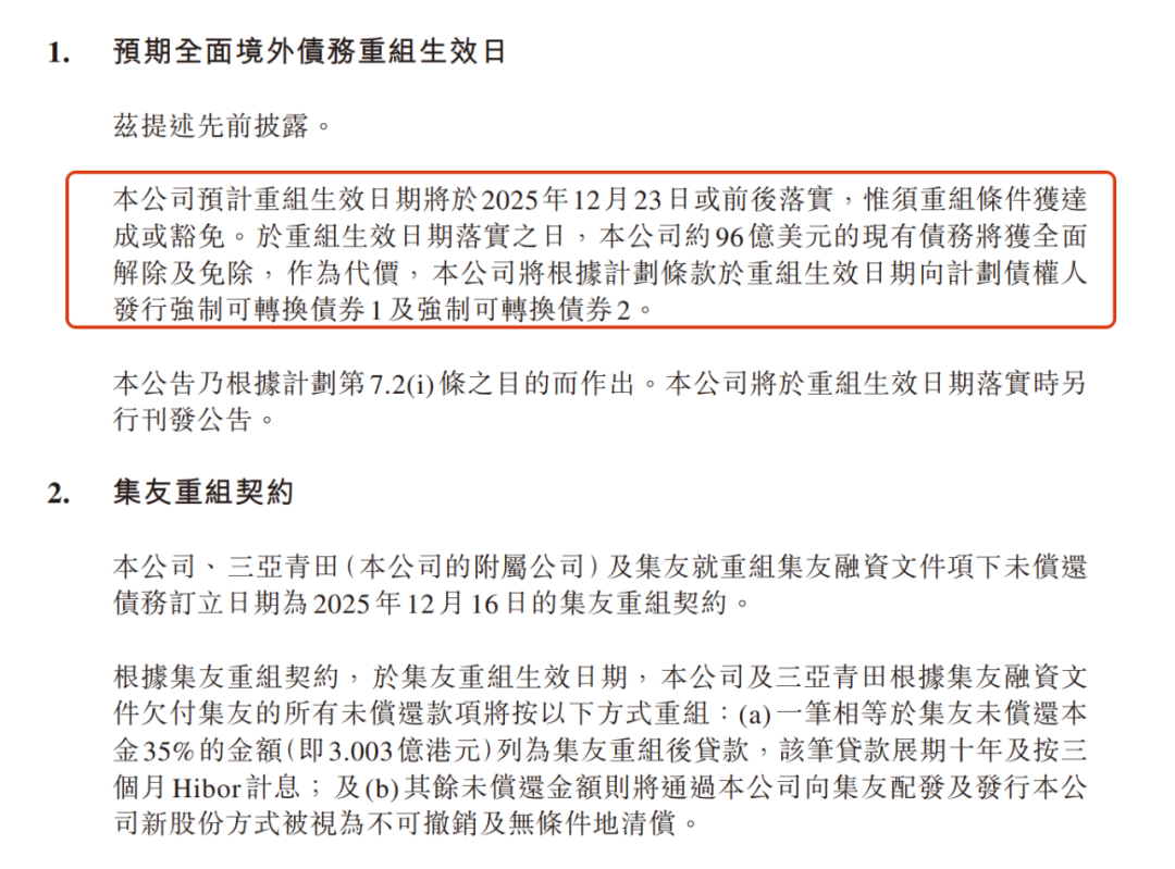 值得注意的是,12月17日融创中国发布公告称,其债务重组生效日期预计于2025年12月23日或前后落实,惟须重组条件获达成或豁免。于重组生效日期落实之日,公司约96亿美元的现有债务将获全面解除及免除。