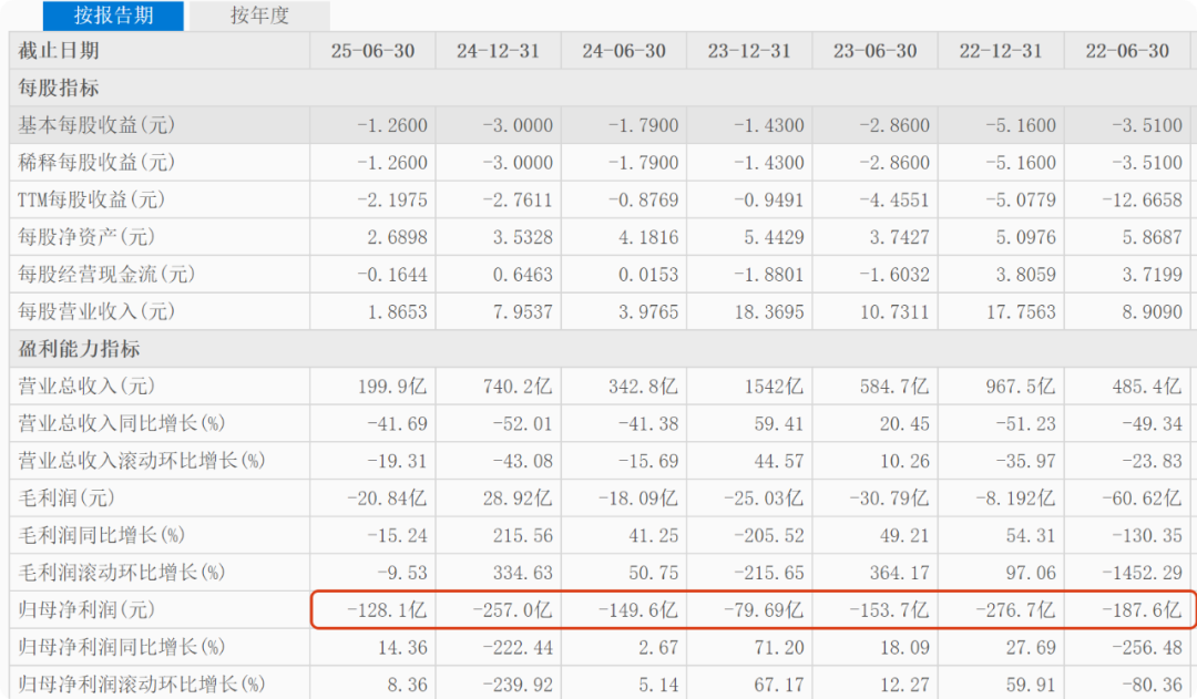 融创今年上半年营收199.9亿元,同比下滑41.69%。归母净利润-128.1亿元,同比下滑14.36%,相比上一年同期的-149.6亿元大幅收窄,这意味着融创现在虽然还在亏损,但相比此前几年已经大幅收窄,正在逐渐变好。