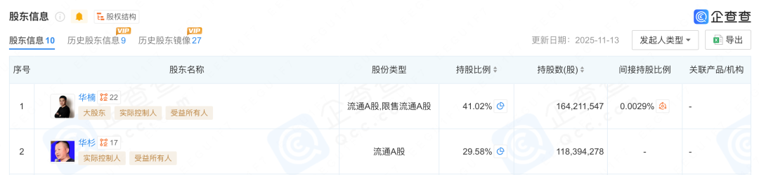 不过,截至三季度末,华楠与华杉直接持股比例分别为41.02%与29.58%,加上一致行动人持股,合计控制约71.91%股权,仍具备绝对控股权。