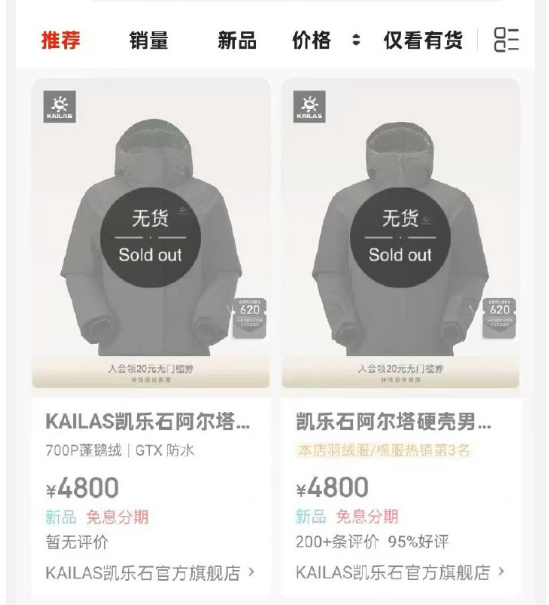 然而俗话说,风水轮流转,如今的凯乐石已经成为全球三大全系攀登品牌之一,它的衣服售价,已经不是普通人够不到的存在,一件羽绒服,就能卖到4800元,还能缺货。
