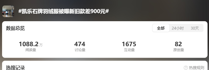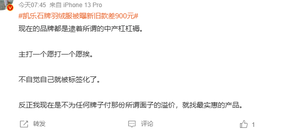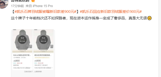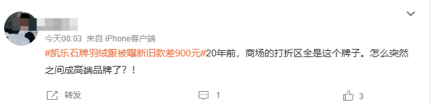 就好比今日,又有一个关于羽绒服的话题冲上热搜——凯乐石牌羽绒服被曝新旧款价差900元。