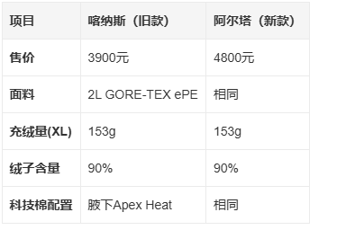 然而不少消费者发现,这款新品和之前的旧款“喀纳斯”均采用2L GORE-TEX ePE防水面料,填充700FP鹅绒(绒子含量90%),同尺码(如XL)充绒量均为153g,腋下均嵌入Apex Heat科技棉。