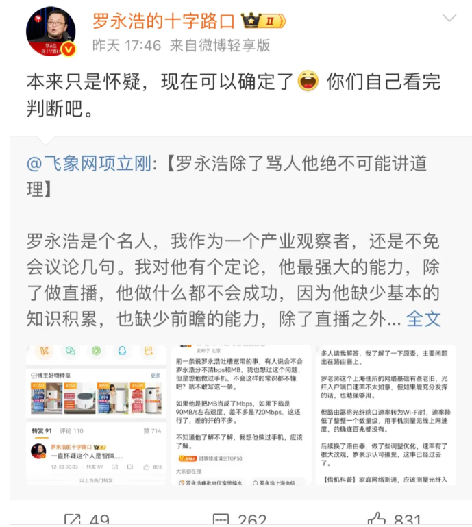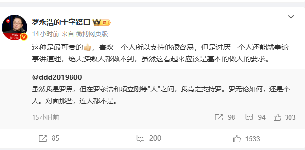 同时,他还转了另外一位网友对这件事的评论,该网友表示:虽然我是罗黑,但在罗永浩和项立刚等"人"之间,我肯定支持罗。罗无论如何,还是个人。对面那些,连人都不是。