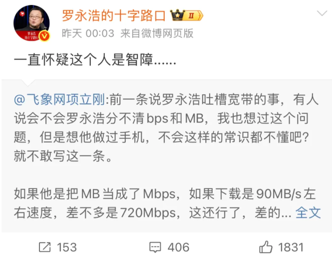 而在上海电信这件事中,意外地卷入了一个项立刚。起因是项立刚质疑罗永浩的专业性,然后罗永浩就怒了,称:一直以为这个人是智障。