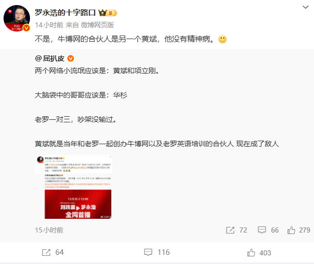 比如,他转发一博主对项立刚和罗永浩点评,该博主表示:两个网络小流氓应该是:黄斌和项立刚。大脑袋中的哥哥应该是:华杉,老罗一对三,吵架没输过。黄斌就是当年和老罗一起创办牛博网以及老罗英语培训的合伙人 现在成了敌人 。