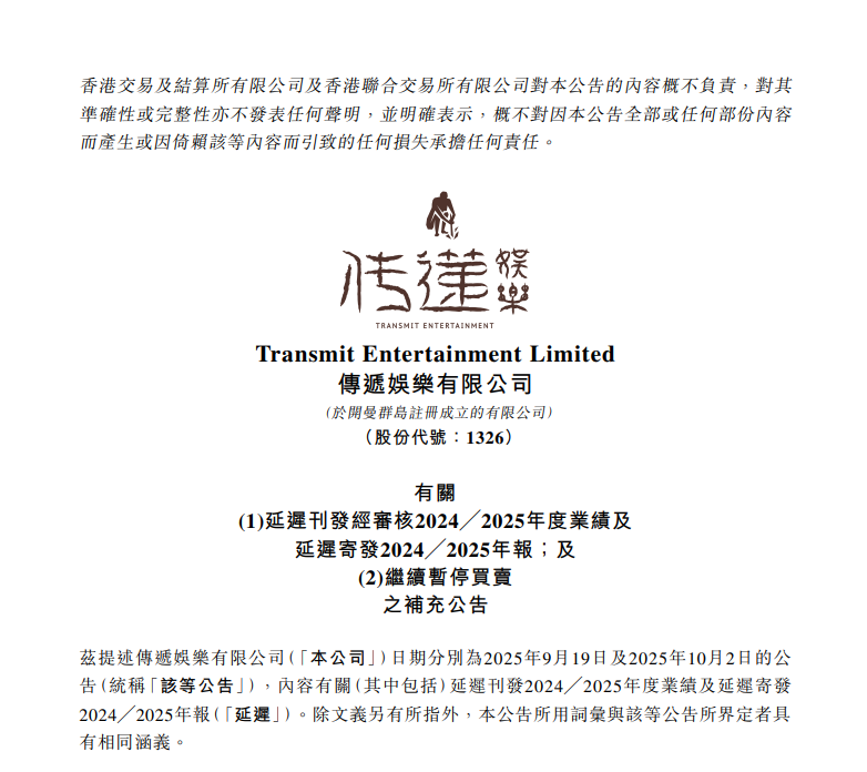 12月15日,传递娱乐发布有关延迟刊发经审核2024/2025年度业绩。