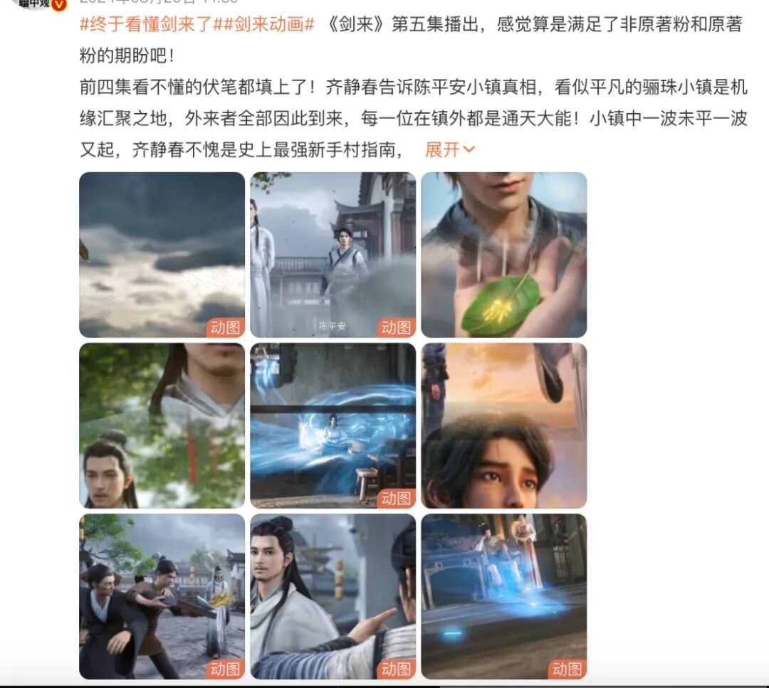 “让国漫界见识一下什么叫群像巅峰吧!”《剑来》动画第二季开播前一周,有抖音用户在账户上转发了官方发布的六张群像海报,并配上这个文字。