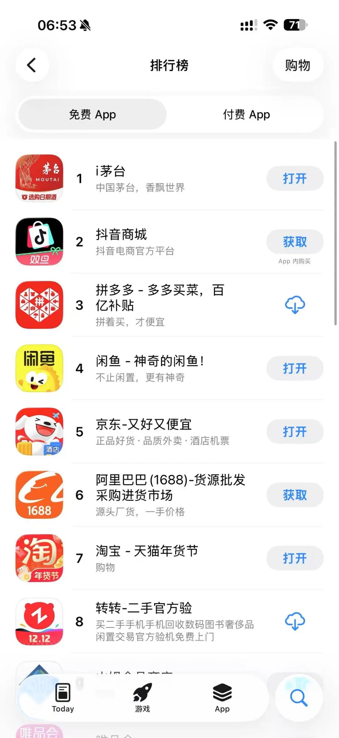 1月5日,i茅台APP登顶苹果App Store应用商店免费购物榜第一名,免费总榜单中位列第四。