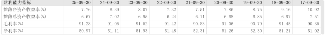 2024年茅台毛利率和净利率为91.93%和52.27%,2025年前三季度毛利率为91.29%,净利率为52.08%,整体上看下降不少,同比2024年前三季度91.53%毛利率和52.19%的净利率也有一定下滑。