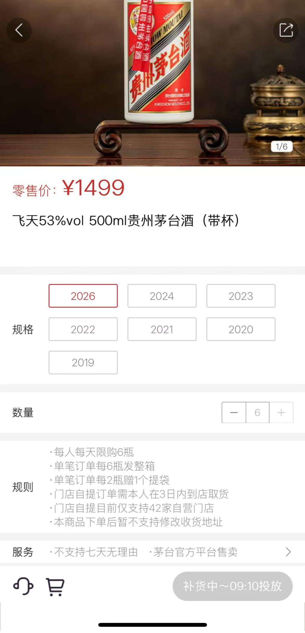 i茅台上显示,飞天茅台还推出了2019年至2026年不同的年份酒,年份越久越贵,2026年新酒价格为1499元,2019年的价格则是2649元,2020年价格为2459元,进一步反映出飞天茅台酒越放越值钱的现象。