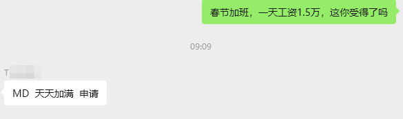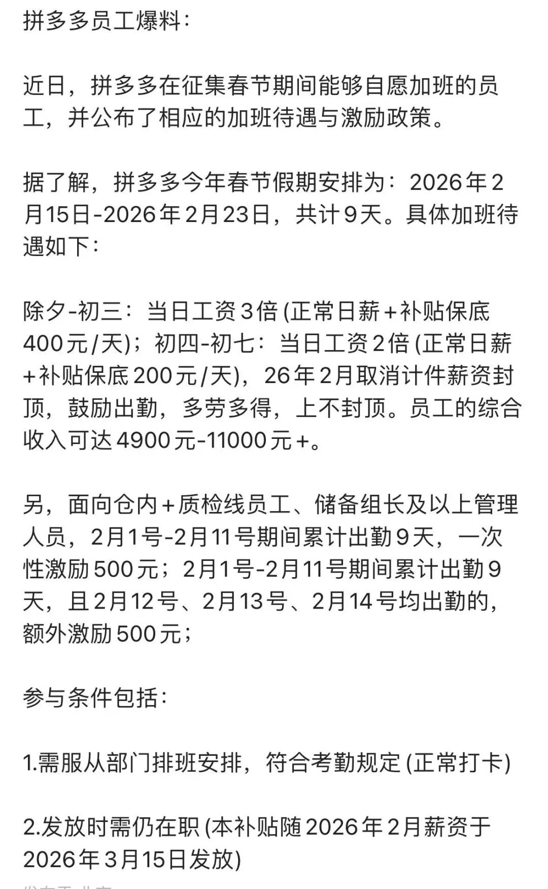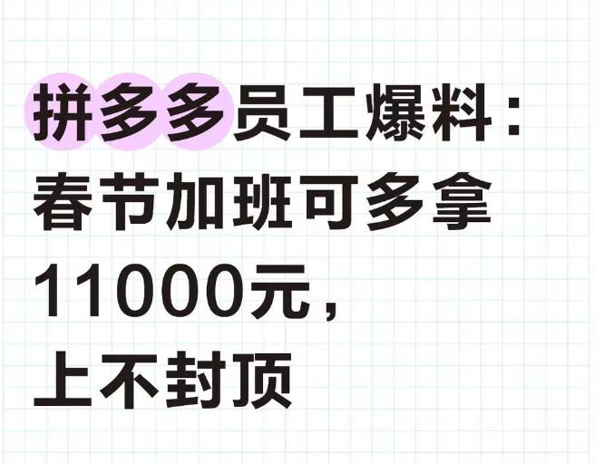 大概是有传闻称,春节临近,拼多多在公司内部征集愿意春节加班的员工,三倍薪资起步,研发岗一天可以拿到1.5万!
