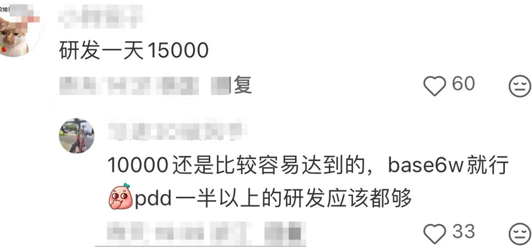 而在这些爆料帖的评论区,有人表示,研发岗一天15000元。也有人评论称,一天1万是比较容易达到的,base 6万就行,拼多多一半以上的研发应该都够。