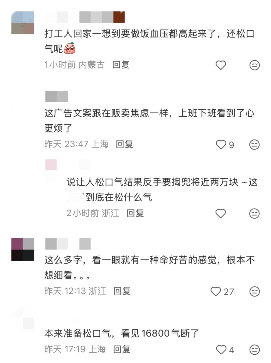 众多网友纷纷表示文案简直在贩卖焦虑,看的人心更烦。还有网友称,“本来准备松口气,看见价格‘气断了’。”
