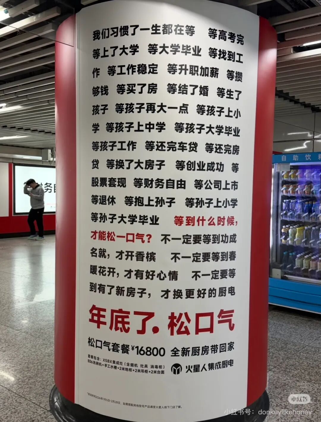 地铁站柱子及换乘通道的广告墙上,充斥着印着“等高考完,等上了大学”、“等生了孩子”、“等还完房贷”等高度密集性文案。