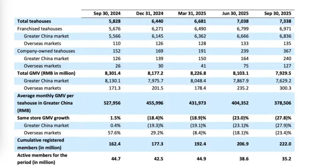 根据天眼查及公开信息显示,截至2025年前三个季度,霸王茶姬全球门店超7000家,注册会员增长至2.22亿。其中,海外业务的异军突起功不可没。