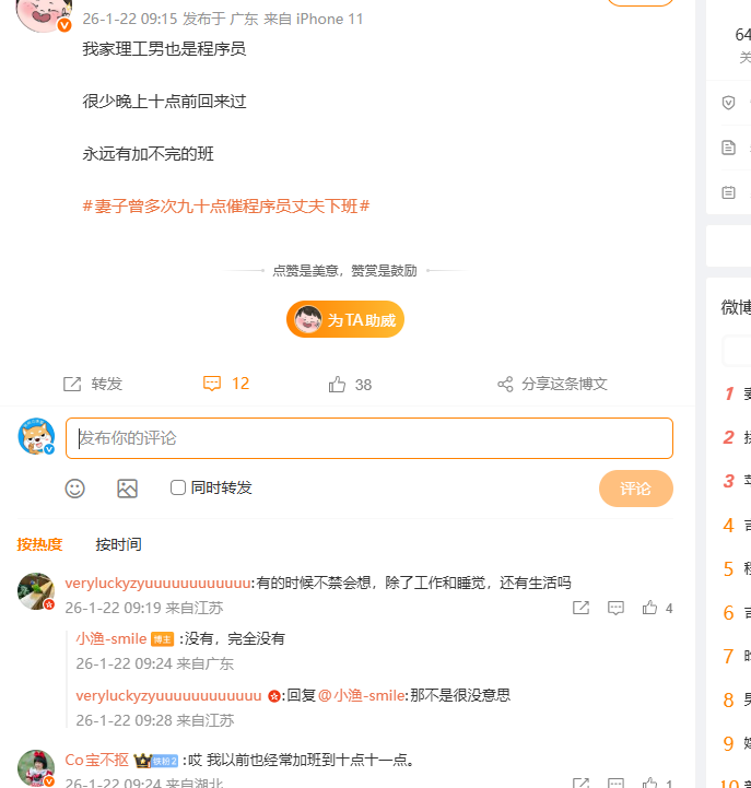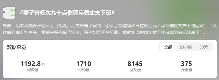 这也不难看出,这位程序员高强度加班是日常。而在这条生命戛然而止的热搜中,不少人表示对这种加班文化,丝毫没有办法,尤其这些年工作不好找,加班内卷更是越来越严重了。比如有人表示:丈夫“不是出差就是加班,头发肉眼可见花白”;另有人无奈表示“项目上线前永远只剩一个bug,实际永远解决不完”。