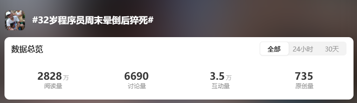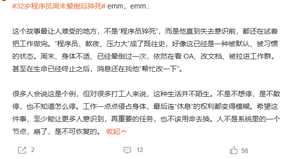 又一起悲剧发生了!一位年仅32岁的程序员周末晕倒后猝死的新闻一大早冲上热搜!