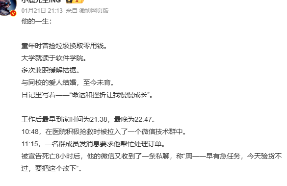 也有网友总结了他这短暂的一生,让无数打工人泪目:童年时曾捡垃圾换取零用钱。大学就读于软件学院。多次兼职缓解拮据。与同校的爱人结婚,至今未育。日记里写着——“命运和挫折让我慢慢成长”。工作后最早到家时间为21:38,最晚为22:47。10:48,在医院积极抢救时被拉入了一个微信技术群中。11:15,一名群成员发消息要求他帮忙处理订单。被宣告死亡8小时后,他的微信又收到了一条私聊,称“周一一早有急任务,今天验货不过,要把这个改下”。