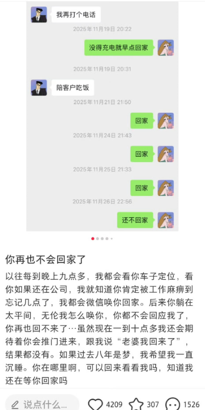 “以往每到晚上九点多,我都会看你车子定位,看你如果还在公司,我就知道你肯定被工作麻痹到忘记几点了,我都会微信唤你回家。后来你躺在太平间,无论我怎么唤你,你都不会回应我了,你再也回不来了...“