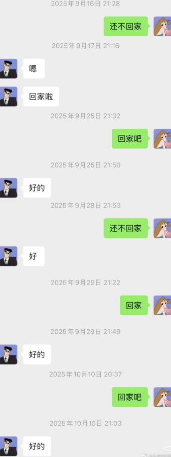 而在这件事冲上热搜后,看哭网友的还有其妻子晒出的日常催丈夫回家的聊天记录。
