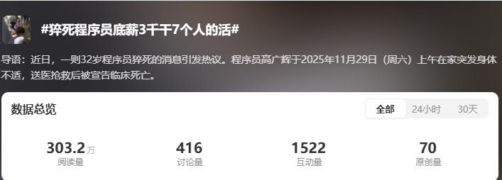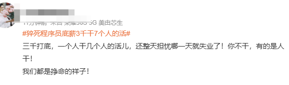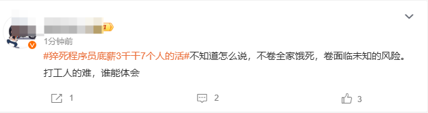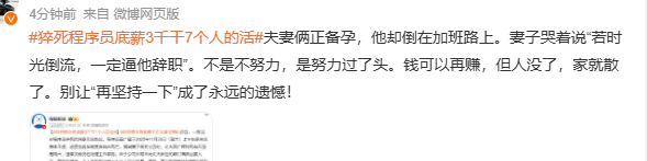 当然,加班、996也就算了,最核心的是,在上一轮企业集体降本增效后,如今一个人干几个人的活,似乎也成了常态。比如“程序员”猝死这件事中,程序员妻子进一步曝出,其丈夫生前在这家公司底薪只有3000,一个人干七个人的活,相关话题今日一大早也是冲上热搜。