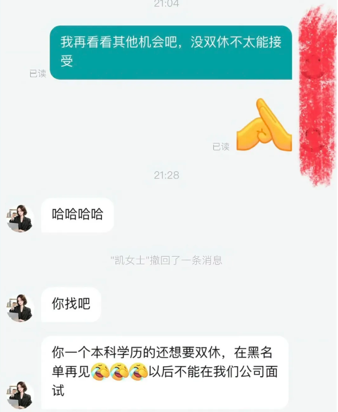 在职场极致内卷的背景下,不仅高强度加班成了标配,如今就连单休也成了很多企业用工的基础条件。如今去找工作,很多情况下当打工人提出双休要求,HR会以为遇到了怪物,免不了一顿数落。比如除了上述讽刺本科生不配有双休的案例之外,还有HR强势的表示,不漂亮哪有什么单休,你只配跪在我办公室……