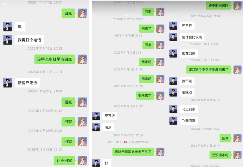 而根据其妻子晒出的与丈夫的日常聊天记录,妻子几乎每天都在催他回家……
