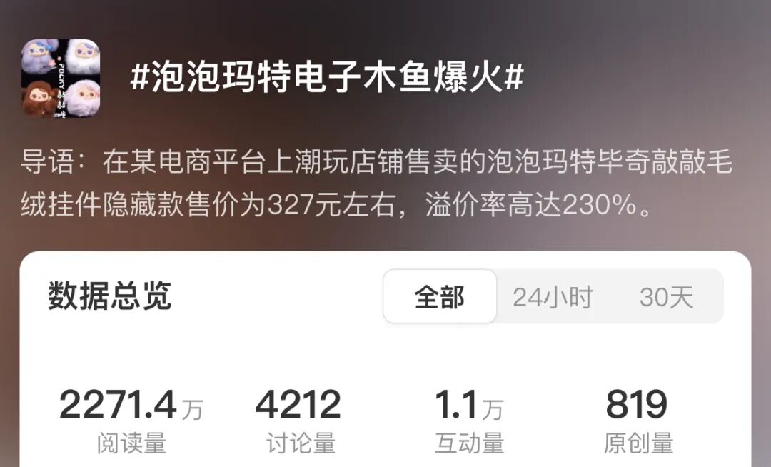 某电商平台上潮玩店铺售卖的泡泡玛特毕奇敲敲毛绒挂件隐藏款售价为327元左右,溢价率高达230%。