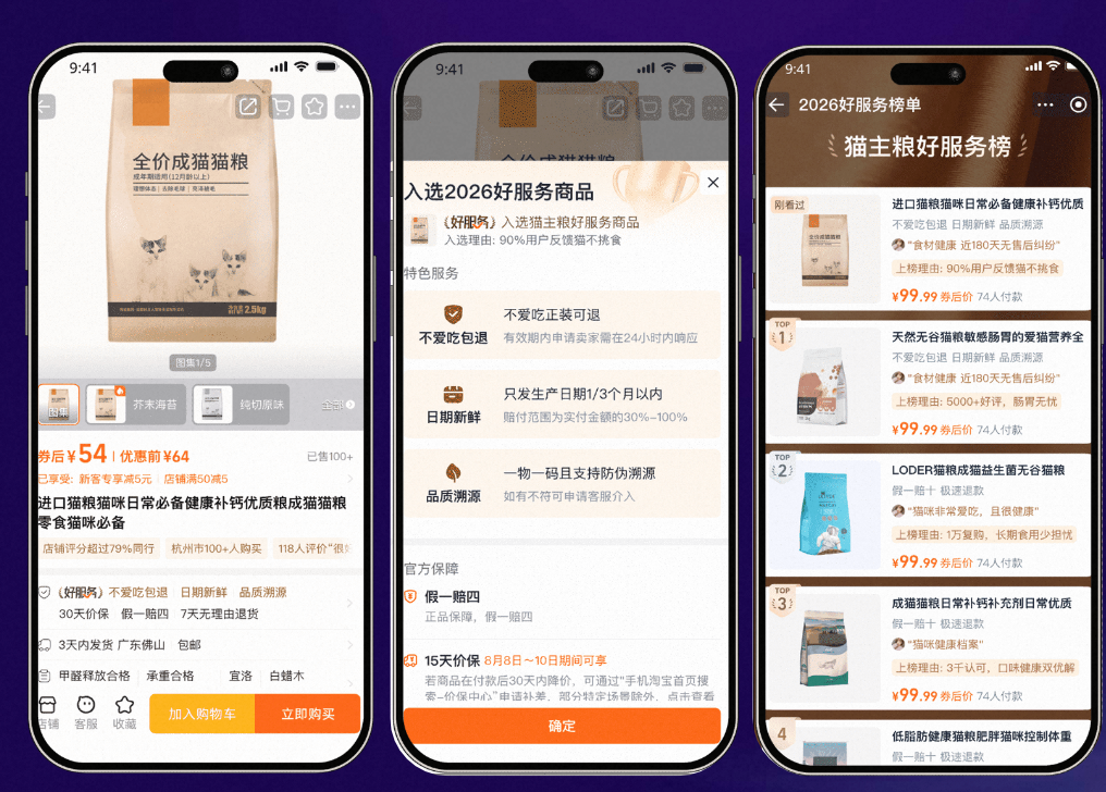 二是让好服务赢得更多曝光。在“高分高流量”的基础上,平台将内测“好服务”榜单,为好服务商家放大曝光机会。首批计划邀请超1000家店铺参与测试,体验分高于4.8分且提供优质特色服务的店铺,将有机会获得“好服务”标识,并在搜索、推荐等核心场景获得标签强化曝光,形成“以服务带流量”的正向循环。