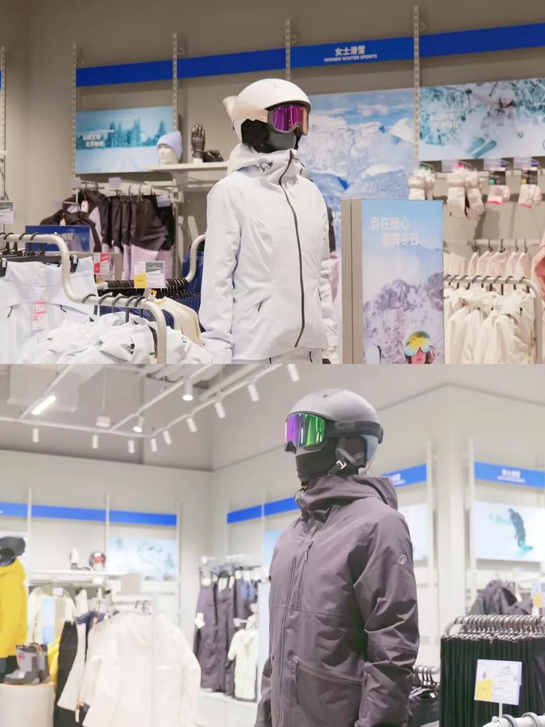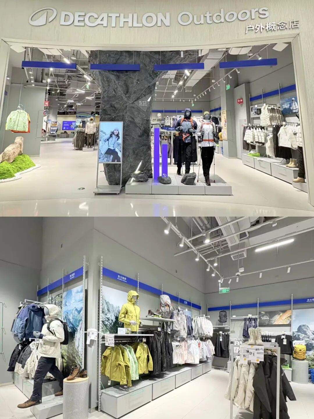 店内采用场景化陈列逻辑,越野跑装备与户外环境海报搭配,滑雪服饰旁设置了头盔、护具等配套单品,部分区域还通过岩壁装置等元素还原户外氛围,替代了传统综合店的混合陈列方式。从视觉呈现来看,门店更强调户外场景的沉浸式体验,各专区均以对应运动的实景画面作为背景,专业装备的参数信息也直接展示在产品旁,突出了户外品类的专业性与功能性。
