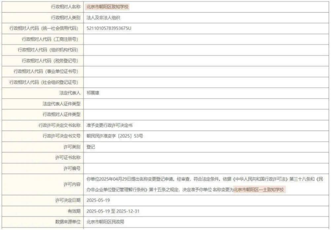 根据51上好校在2025年8月的报道,北京市朝阳区民政局连续发布5条《准予变更行政许可决定书》,涉及到了朝阳区的3所民办学校:致知、一土和燕京实验。