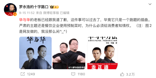 罗永浩特别表示,已经在网上买了华与华的全集,整天被忽悠的中国土老板们,其实赚钱很不容易,也该有人给他们上一点营销防诈课了,“今天下午六点之前,如果华杉没有在微博公开道歉,未来中国的市场公关行业应该不会有人再记得华与华了,只记得罗与华。”