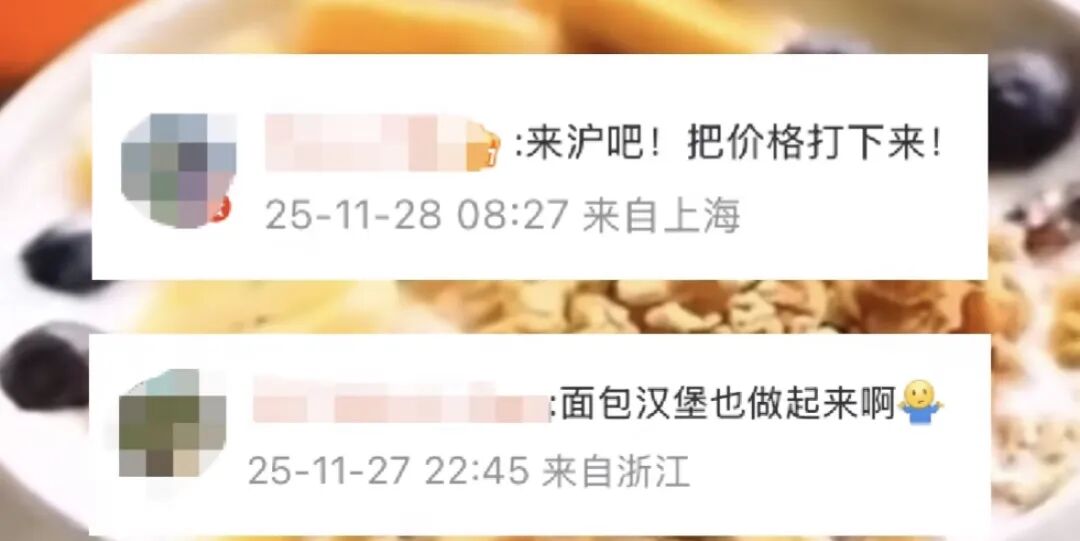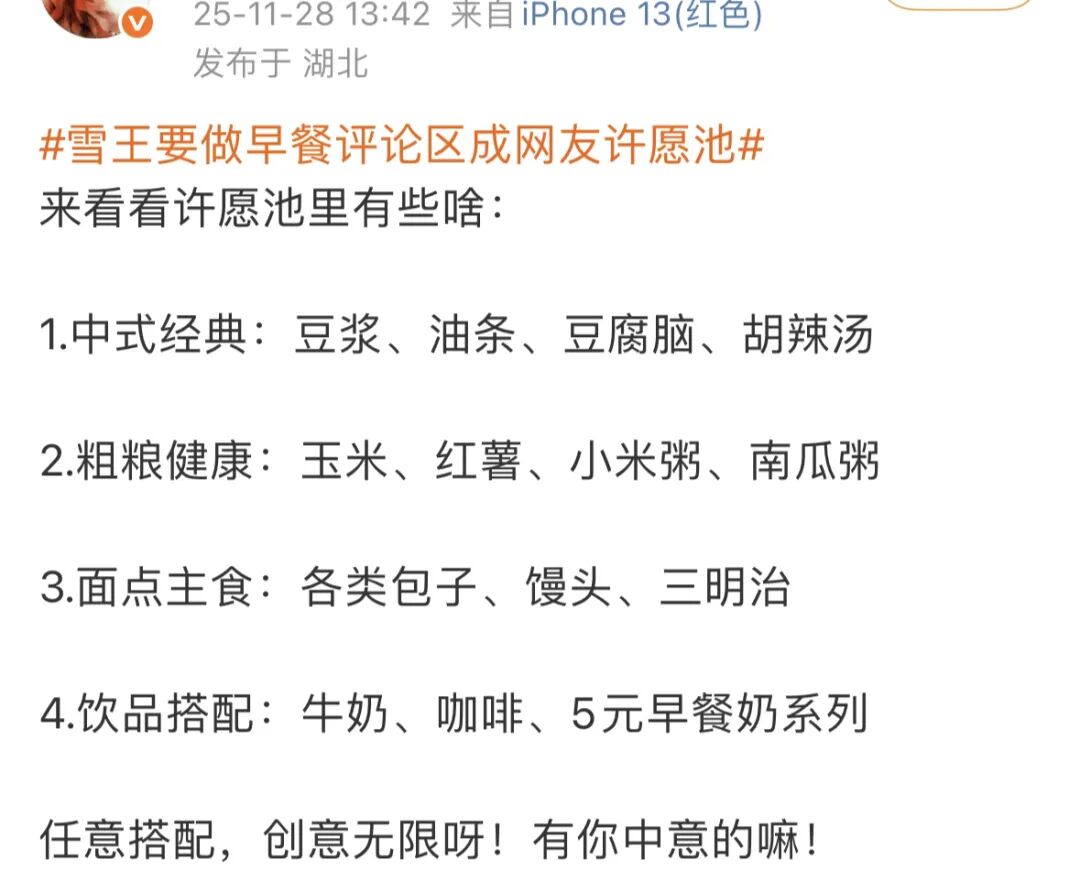 还有网友总结了蜜雪冰城评论区大家的呼声,主要包括中式经典:豆浆、油条、豆腐脑、胡辣汤 ;粗粮健康:玉米、红薯、小米粥、南瓜粥 :面点主食:各类包子、馒头、三明治;饮品搭配:牛奶、咖啡、5元早餐奶系列……