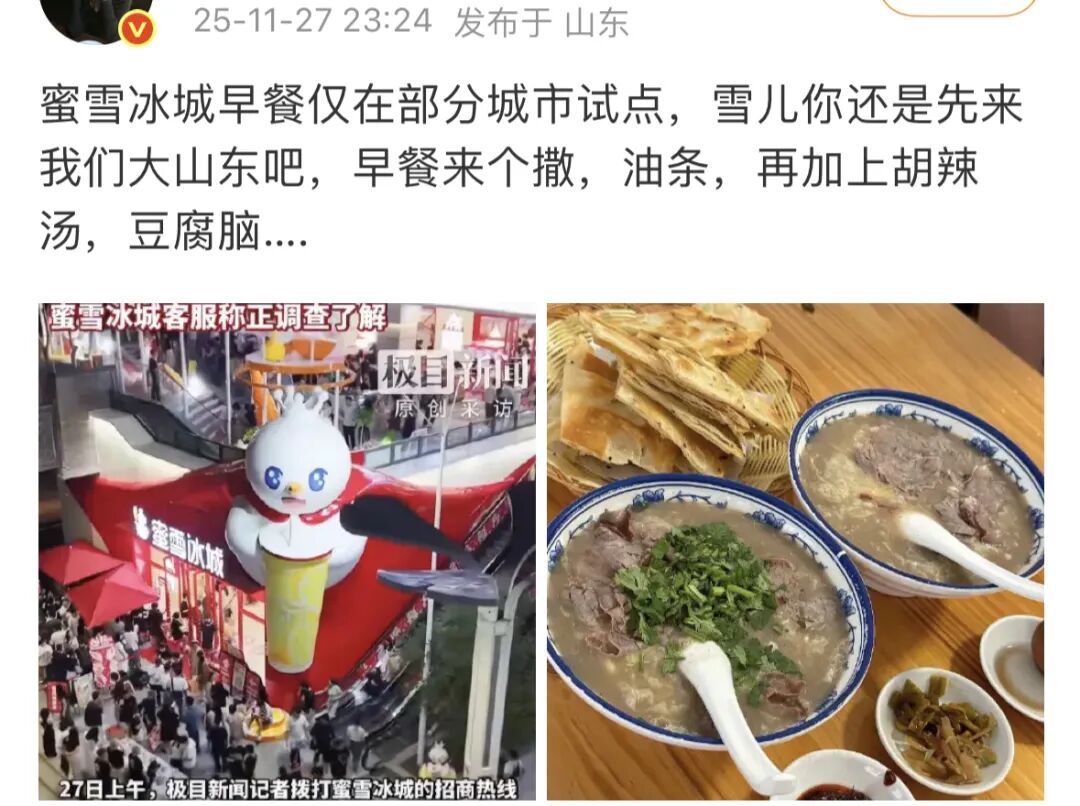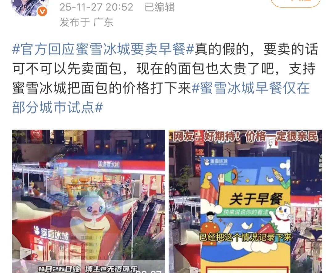 随后,关于蜜雪冰城部分城市试点早餐的话题冲上热搜!