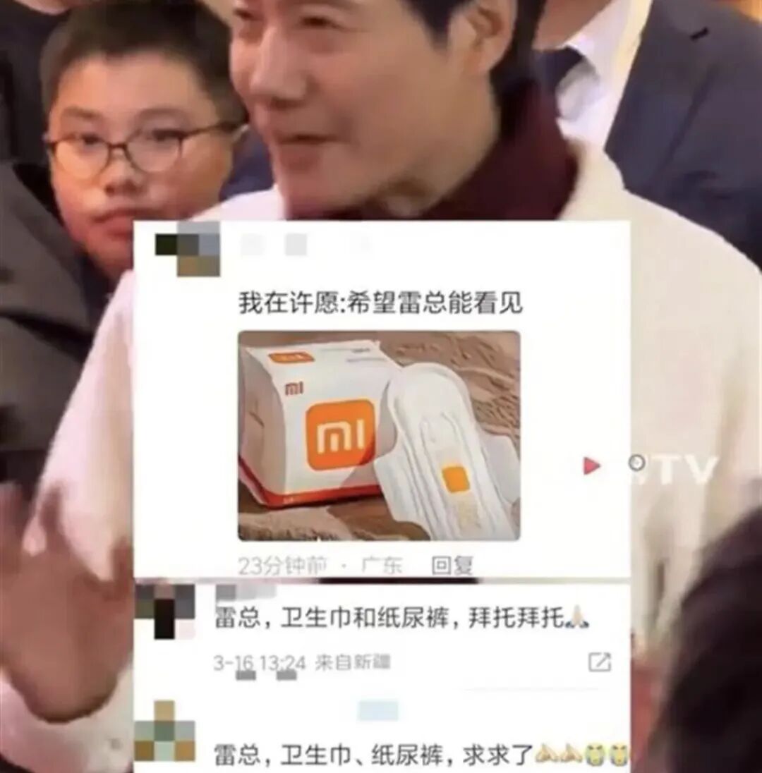 要是消费领域谁最深入人心,就得看谁的评论区会成为赛博许愿池!以前是雷军,什么行业塌房了,网友就会跑到雷军评论区,让小米生态链赶紧做一个。比如今年的卫生巾集体塌房后,雷军的评论区全是让小米做卫生巾的,甚至网友都帮小米设计好了。