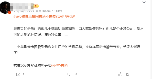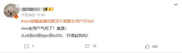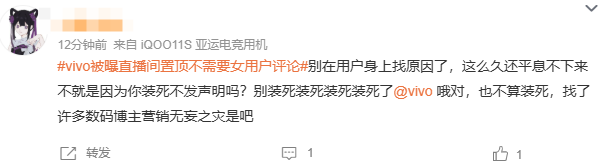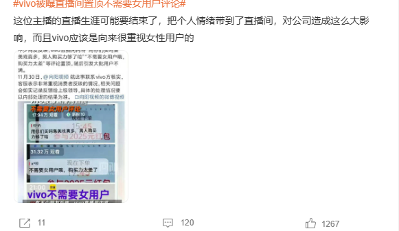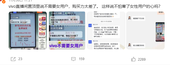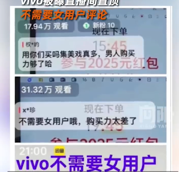 “vivo直播间置顶里说不需要女用户,购买力太差了。 这样说不怕寒了女性用户的心吗?”