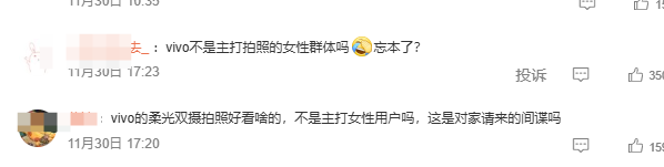 “vivo不是主打拍照的女性群体吗,忘本了?”“vivo的柔光双摄拍照好看啥的,不是主打女性用户吗,这是对家请来的间谍吗”