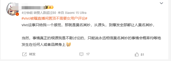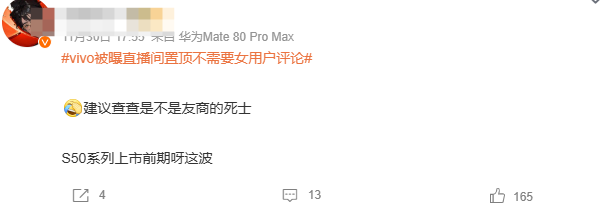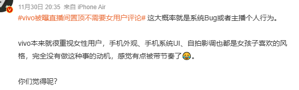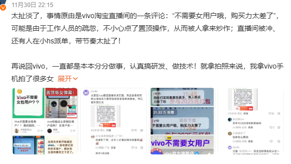 对此,有用户解释,“可能是误操作。事情缘由是vivo淘宝直播间的一条评论:“不需要女用户哦,购买力太差了”,可能是由于工作人员的疏忽,不小心点了置顶操作,从而被人拿来炒作”