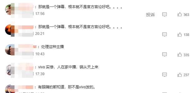 不过,也有网友质疑,这一波舆情来得很突然。比如有位网友表示:“那就是一个弹幕,根本就不是官方言论好吧。。。。”“vivo 实惨,人在家中播,锅从天上来”
