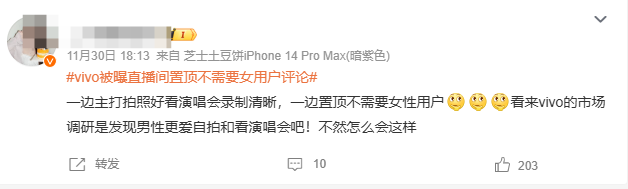 “一边主打拍照好看演唱会录制清晰,一边置顶不需要女性用户,看来vivo的市场调研是发现男性更爱自拍和看演唱会吧!不然怎么会这样 ”