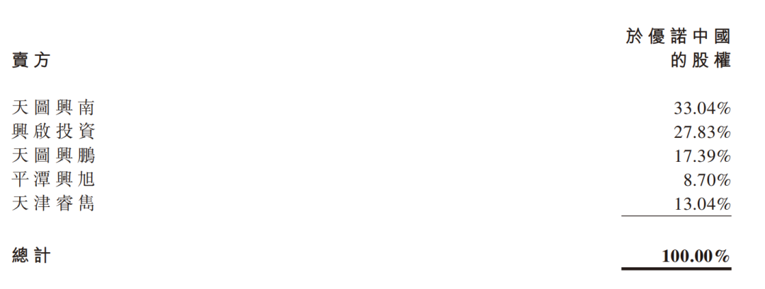 与此同时,其他卖方天图兴南、平潭兴旭将同步出售所持优诺中国约41.74%股权,对价为7.51亿元。