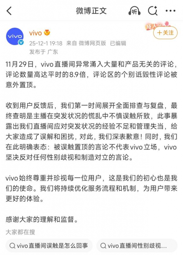 由于vivo发布X300手机时,曾邀请了多位B站UP主观看发布会,其中就包括逍遥散人;因此,这次事件也让vivo受到牵连,一些人去vivo直播间、官方评论区刷屏,大有不死不休的架势。11月29日,vivo直播间涌入大量与产品无关的评论,直播人员面对突发状况把评论区个别诋毁性评论意外置顶,其中也包括辱骂直播人员的评论。但极端人员直接给vivo捏造“排斥女性用户”等不实言论,开始无差别攻击各类与vivo相关的内容。